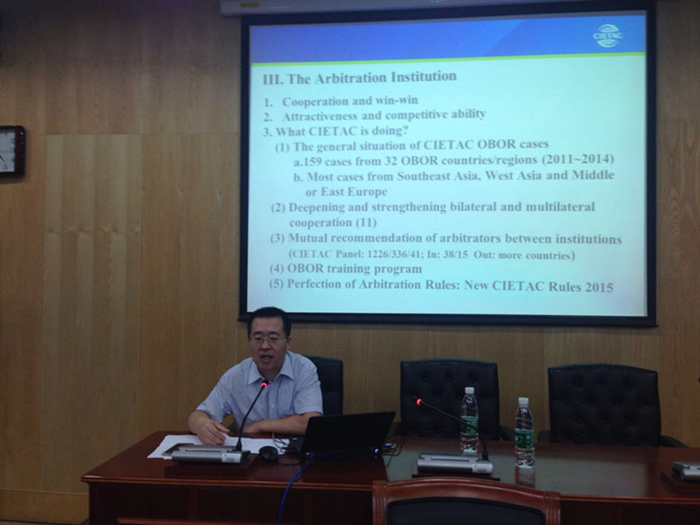 2016年9月25日星期日晚,第四届中国仲裁周国际商事仲裁系列讲座之一,在永利官网模拟法庭举行。中国国际经济贸易仲裁委员会仲裁院李虎副经理,为广大师生做了关于“一带一路与国际商事仲裁 ”的前沿讲座。北外yl9193永利经理万猛教授就讲座内容作出点评,也与大家分享自己的看法和感受,yl9193永利姚琦老师担任讲座主持人。